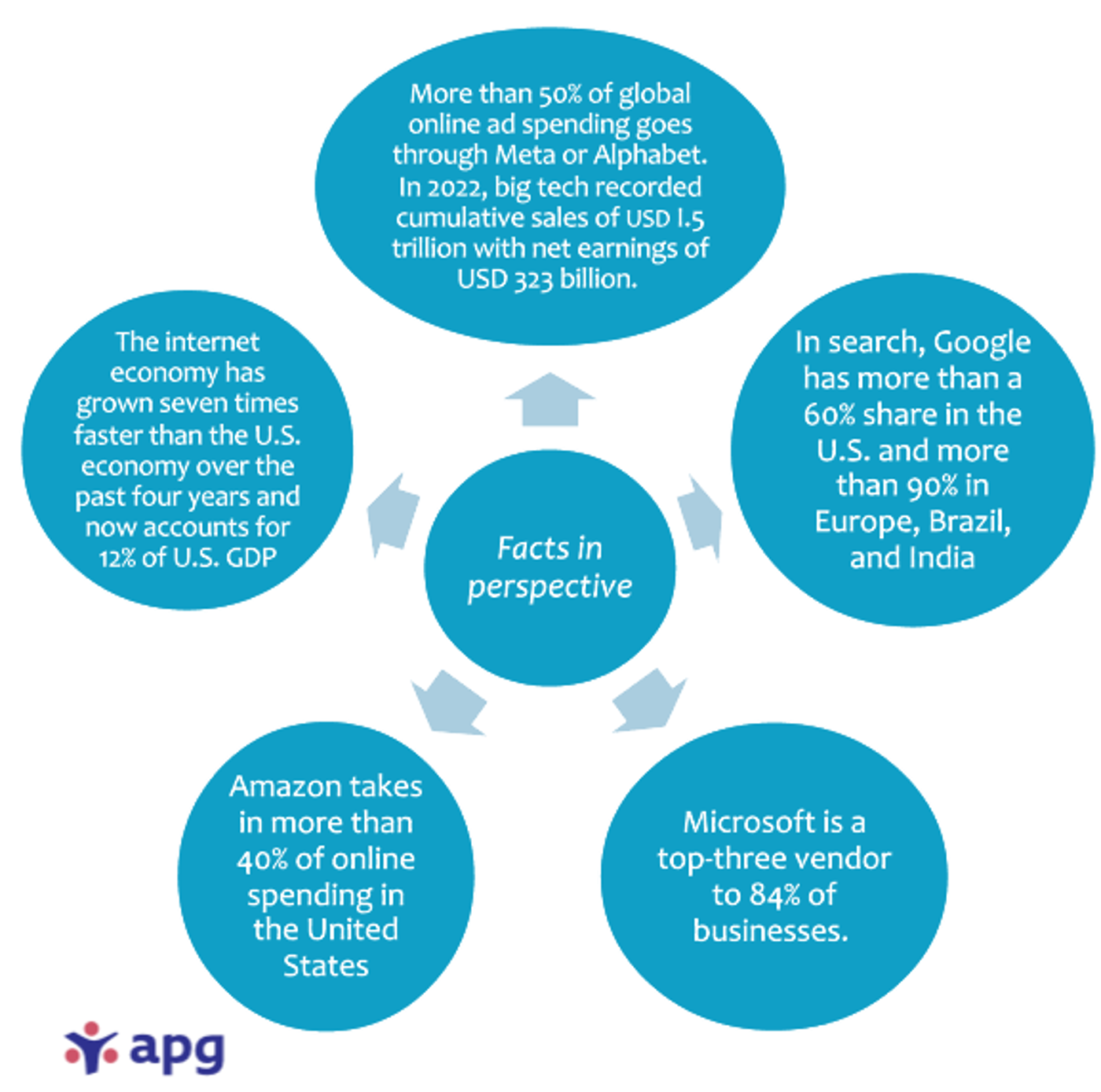 “Together with our portfolio managers, we talked to the five tech giants – Alphabet (Google), Amazon, Apple, Meta (Facebook) and Microsoft. As they are spearheading digital innovation, this was a logical place to start – by trying to set industry standards from the top down,” says Andrews. These companies have complex governance structures, in some cases concentrated share ownership, and wield considerable power. The data in the visual below highlights their dominance. “As a large investor, they usually respond to our request for dialog, but the degree of contact varies considerably, from attending investor meetings with little interaction to discussing specific topics with company specialists. That said, after last year’s market wobble and increasing public scrutiny, companies are more receptive to entering into a dialog with investors.”